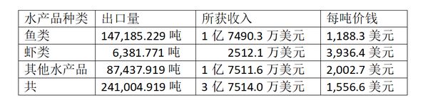 在这样向国外出口的水产品中,鱼类出口达147,185.229吨,获得1亿7490.3万美元的收入;虾类出口6,381.771吨,获得2512.1万美元的收入;其他水产品出口87,437.919吨,获得1亿7511.6万美元的收入。