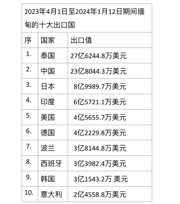 十大出口国没有什么变化,英国早在前几周时就已被排除出“十大”之列,意大利取代了其位置。而缅甸的两个最大贸易伙伴还是泰国与中国,这也没什么变化。