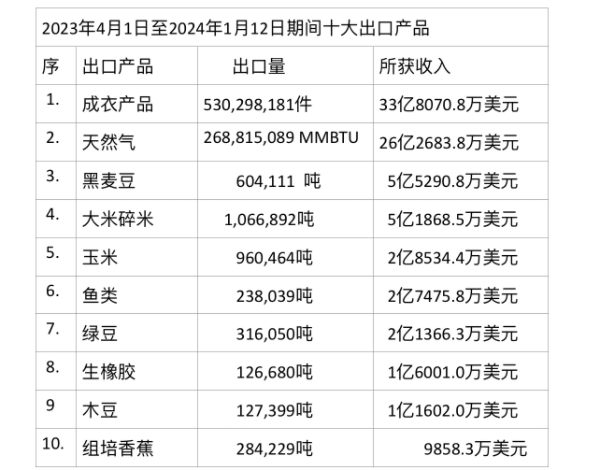 而2023年4月1日至2024年1月12日期间十大出口产品及十大出口国分别为如下: