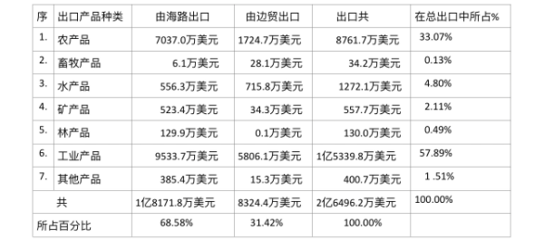 出口渠道中,海路出口占主要地位,超过三分之二,边贸渠道出口则不到三分之一。