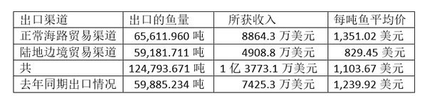 海路出口的鱼量与边贸出口的鱼量相差不大,但海路所获收入却远多于边贸所获收入,究其原因就是每吨鱼所获价钱的不同。同样的,去年同期出口的鱼类虽远少于今年,但平均每吨鱼所获价钱却高于今年。