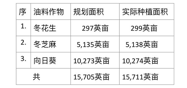 在现2024—25财政年度冬作物种植季节期间,皎栖县区方面规划种植297英亩油料作物花生,实际种植299英亩。规划种植5,135英亩芝麻作物,实际种植面积5,138英亩。规划种植10,273英亩向日葵,实际种植10,274英亩。规划种植的各种油料作物15,705英亩,实际种植15,711英亩,多种植6英亩。
