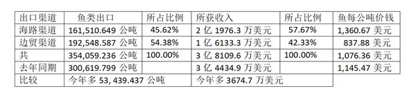 这样出口时,海路渠道出口少于边贸出口。但所获收入却是海路渠道比边贸渠道还多。造成这样的原因,就是所获价钱不同所致。海路出口时,每公吨鱼类获1,360多美元,而由边贸出口时,每公吨价钱却只有837美元多。