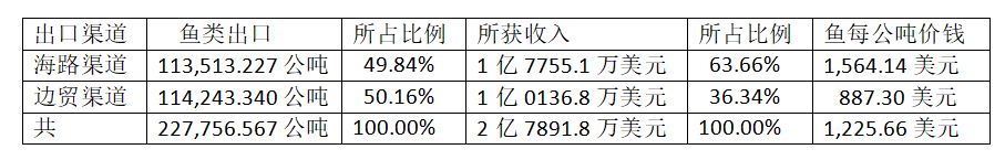 这样出口时,海路渠道出口与边贸出口两者相差不很大,现在由正常海路渠道出口的鱼类甚至还略少于边贸渠道的出口。但所获收入两者却差距甚大,海路出口收入约占全部出口的五分之三以上比例,边贸出口收入不到全部出口收入的五分之二。造成这样的原因,就是所获价钱不同所致。海路出口时,每公吨鱼类获1,564多美元,而由边贸出口时,每公吨价钱却只有887美元多。