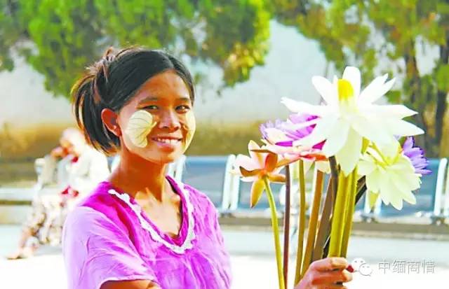 缅甸人85%以上信仰佛教。几乎每一辆公交车和出租车后视镜后方都贴着佛像,佛像前大都挂着礼佛的鲜花,穿成串的金盏花或茉莉,香气四溢。红绿灯附近十几岁的小孩儿手里拿着一串串鲜花,目标客户是车里的乘客。缅甸人绝大部分信仰小乘佛教,与国内寺庙不同的是,缅甸佛寺礼佛方式不是烧香而是献花。用鲜花礼佛是日常需求,本土产鲜花很便宜,小玫瑰只要人民币十来块钱就可以买一束。