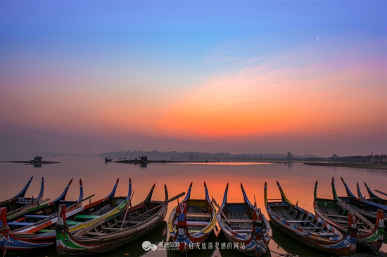大多数游人会选择在日落时来观乌本桥,而我则更喜欢日出时的那份恬静,玫红中带着蓝调,淡淡的,不温不火,虽不似日落般热烈、绚烂、夺目,却让人心中暖暖的、静静的,有种岁月静好的美感。更重要的是,没有了日暮时大巴成堆、人流如织的喧闹,仿佛只有此刻才能把自己沉静在霞光中,看小舟漫游、天色变幻。
