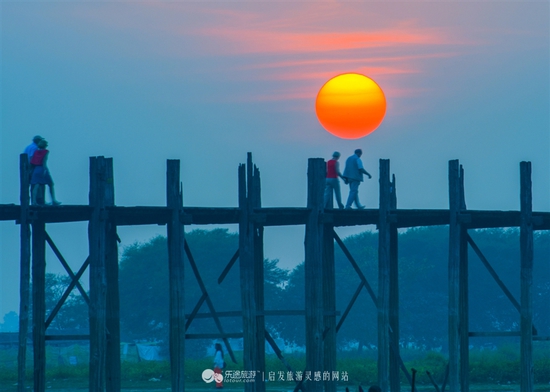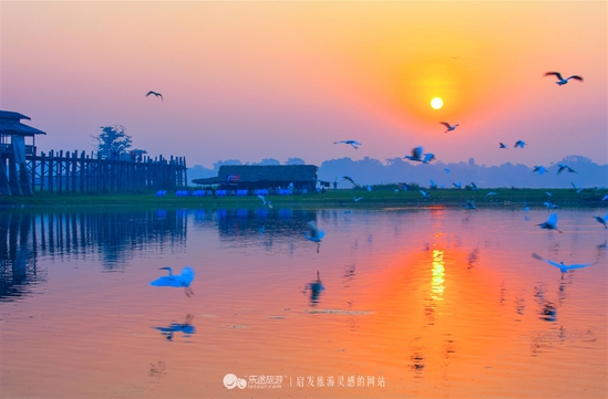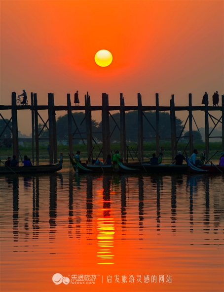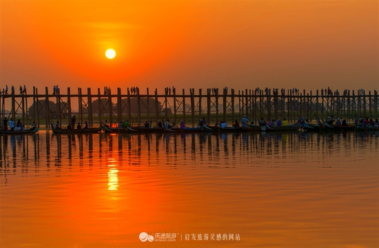 早在我对缅甸还没有什么概念时,就已被网上疯传的乌本桥日落图片迷醉了。当细查资料才发现,乌本桥,其实是1856年贡榜王朝敏东王执政时所实施的一项便民惠民举措。据说当地因为地势低洼,一到雨季便湖水上涨,不仅淹没了湖岸上的菜园庄稼,一片汪洋也给百姓的生活、交通带来诸多不便。为了解决这个困难,敏东王下令在湖的两端以1086根耐腐蚀的珍贵柚木为柱修建了这座长1188.7米的纯柚木大桥。信奉佛教的敏东王为了给走在桥上的百姓遮阳挡雨,又在长长的桥上修建了六座以僧团生活准则“六和精神”(即戒各同修、身和同住、口和无诤、意和同悦、见和同解、利和同均)为名的风雨亭。与国内许多情侣爱在一个有特别意义的地方结挂同心锁一样,对早已将佛教教义默化至生活方方面面的缅甸恋人来说,乌本桥六和亭所传承的和睦互敬精神,就是他们最好最浪漫的爱情誓言。乌本桥也由此多了一个浪漫的名字——“爱情桥”。