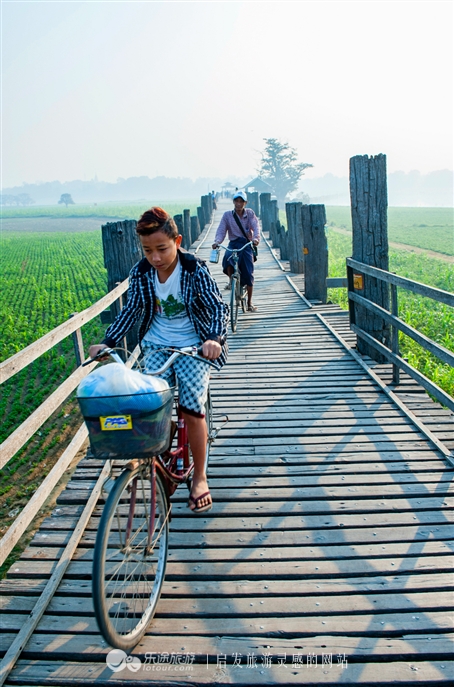 除去乌本桥所包装的浪漫意义,对于本地人来说,它,只是他们每天要走的路。自行车,也只有在清晨和上午才能在桥上骑起来,若是在傍晚,他们只能推着它在密集的人流中挤着走。