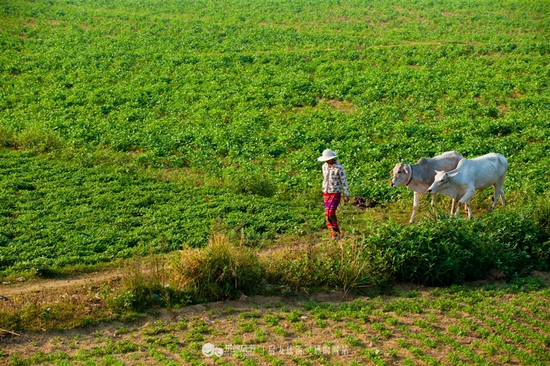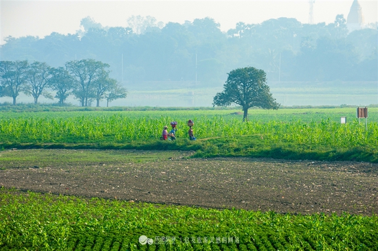 旱季的桥下,一片翠绿,三个头顶包袱的妇女远远地走在田埂之上,给这片宁静的大地添加了几份灵动。