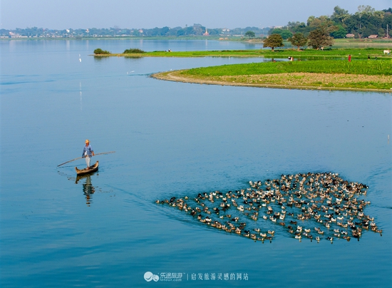 乌本桥边那棵标志性的大枯树静静地倒影在平静的湖水中,树下,一群村民在编织渔网。连这里的鸭群都这么有灵性和情怀,竟自自然然地游成了“心”型队列,难道是受了“爱情桥”的启迪?