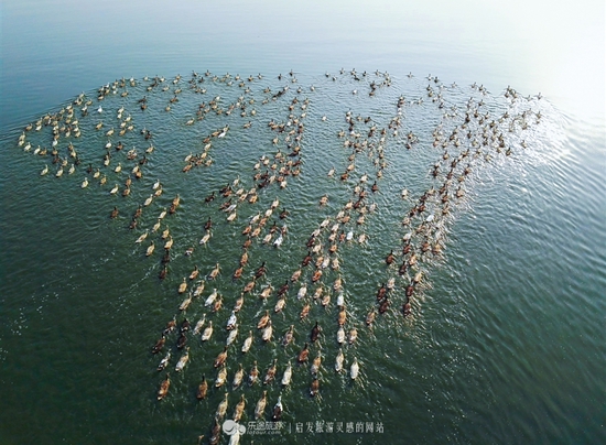 俯瞰桥下,刚才湖中柔婉的鸭“心”转眼变了队形,竟让我找到了航拍非洲草原上驰骋奔腾“角马群”的壮阔之感!