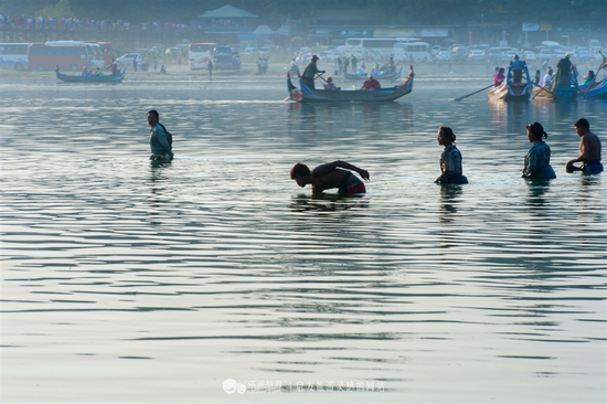 暮色中,几位在湖中拉网捕鱼的姑娘小伙的逆光侧影,又让我仿佛梦游印度河里的某个场景 ......没有租到船的游客,只能找个朝西的岸边,用相机远远地瞄着已被游船包围的乌本桥。