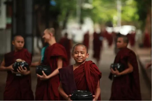 在曼德勒的千人和尚庙,每天都可以看到这样的画面:众和尚在黎明初晓时集体外出托钵,再将托钵回来的食物集中,10点一到,两排长龙般的和尚队伍便依序领食,领餐时他们会将袈裟密实地缚住臂膀,代表对信徒布施的重视与感恩。