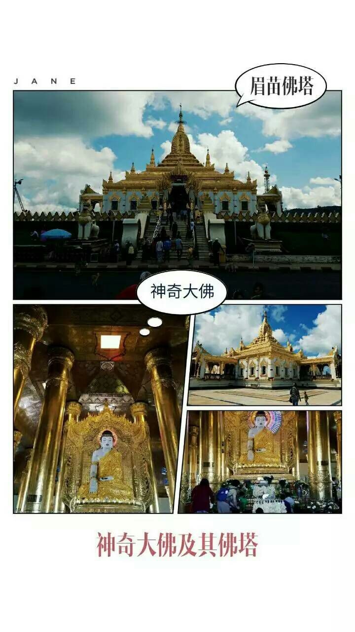10月9日上午坐车到眉苗观看曼德勒境内眉苗县的一个佛塔,里面供奉的是一尊神奇大佛。原在1979年这尊佛像要运送到中国云南瑞丽的,途经眉苗翻车,而大佛丝毫无损,所以当地人认为大佛显灵不愿离开,故建此塔将其供奉在内,平时不少人前往朝拜。