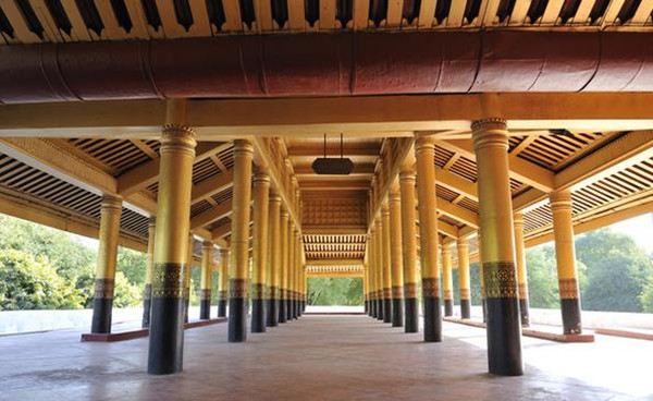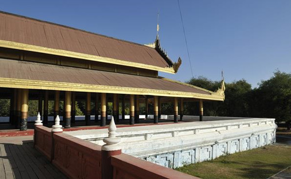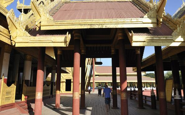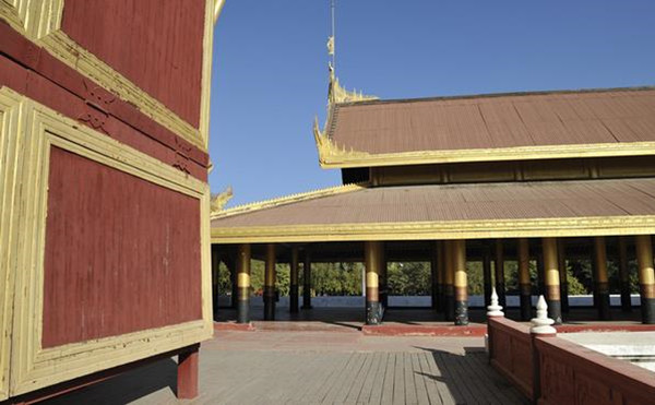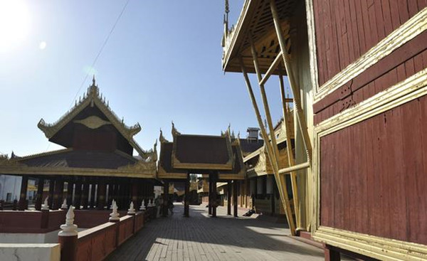 在曼德勒的城市中央,是缅甸的贡榜王朝的皇宫所在地。当我们穿过了城市熙熙攘攘的街巷,抵达皇宫的时候,视野便豁然开朗。宽阔的护城河对面是皇宫低矮的城墙,隐约也能够看见城墙内黄红相间的成片屋顶,汽车围着护城河开了一周,整个皇城面积为4平方公里,呈正方形。规模虽不能和故宫相比,但也完全不失皇家的气派。