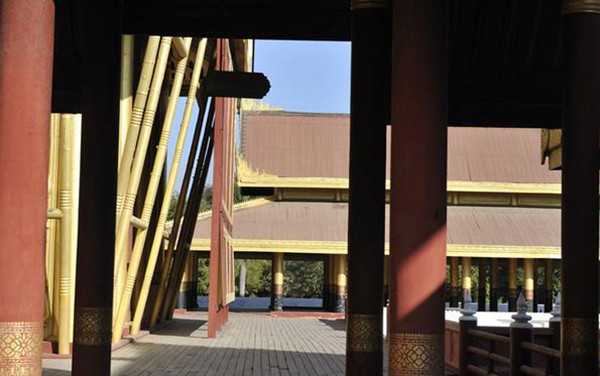 汽车穿过了跨越护城河的桥,大门口站着荷枪实弹士兵。因为目前皇宫只开放了一小部分的面积,剩余的都是军队机关的驻地,包括缅甸陆军总司令部就在这里。进入之后,就会经过一片军营,两旁有一些低矮的木制小阁楼,这是军官的住所,此时正值午后,人们几乎都在午休,非常的安静,这一带的树木长的都很好,显得郁郁葱葱。穿过了这片军队驻地,就进入到皇宫的开放部分。由于旧宫殿在二战时期被火毁掉,目前看到的这些都是根据之前的图纸与照片在原址重建而成。