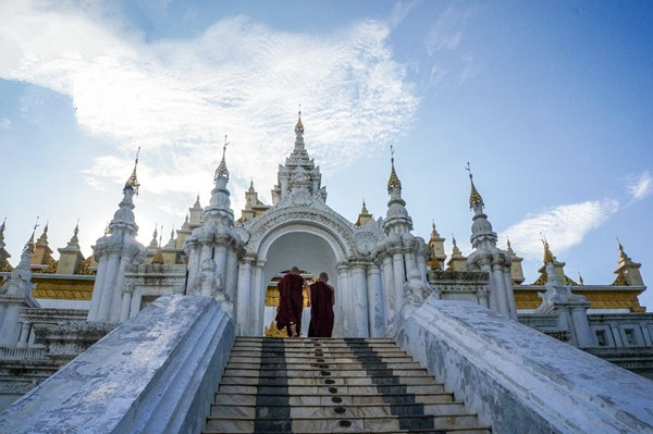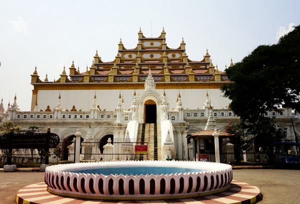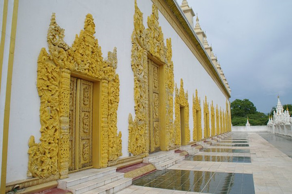 独特僧院位于金色宫殿西侧,与曼德勒皇宫建造时期相同,都是由敏东王所建。原建筑全为柚木,在1890年被烧毁前,一直被称为曼德勒最美的建筑。现在所看到的大多是由缅甸政府于1966年用水泥原址重建的。虽不如柚木那般奢华,但还是保留了原有的建筑雏形。正门需要登上十几级的台阶,然后到大殿外的回廊。整个建筑主要为白色墙壁,门窗和顶部配有金色木雕,风格远看很类似于欧洲的大教堂。大殿内部主要是诵经念佛的地方,除了立柱基本没有其他东西,类似于室内篮球场,看起来空空荡荡。