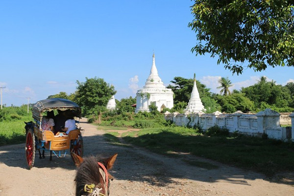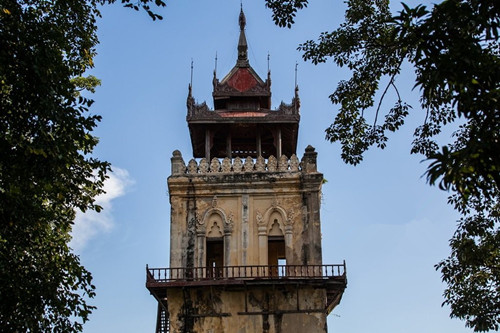 瞭望塔所在位置是曾经的因瓦皇宫旧址,但是经过战乱迁徙地震,除了残破的斜塔,这里已经看不到其他建筑。南明瞭望塔瞭望塔高27米,其兴建者是贡榜王朝的第七代国王孟既(Bgyidaw),在1838年的大地震中,塔顶被震毁,塔身被震歪,现存的塔顶是后来修复的。曾经站在上面,可以鸟瞰整个古城,不过现在的瞭望塔因为地震的原因,已经严重倾斜,出于安全考虑已经禁止攀登。只能在外围看看这座用木头建造的瞭望塔。塔影被高高的野草所包围,远远看去,有一种说不出的寂寥。