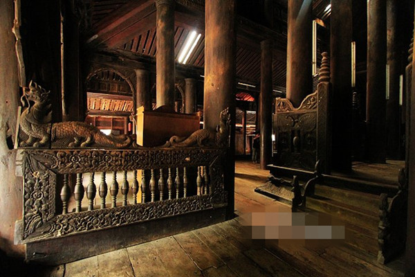 柚木因为含有硅容易让刀变钝,据说是比较难切削的。可是因瓦这座僧院里,柚木做成的栏杆门窗上雕满了精细繁丽的花纹, 线条之细密令人咂舌,可以想象当年雕琢之时费了多少工夫。经过时光之手的摩挲,原本黄褐色的柚木变成了黑色,泛着珠宝一样的幽光,愈发显得高贵典雅。