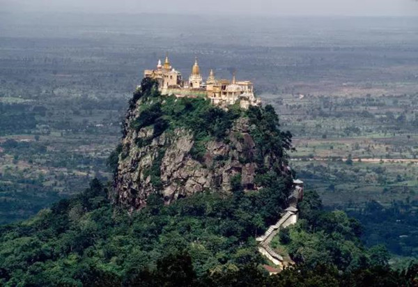 从蒲干王朝开始,它就被当做缅甸的信仰圣地,山上建有纳特神庙和佛塔,也是传说中神灵出现的地方,是纳特神教信徒们心中的圣山。进入山道不久,可以看见云上有一块奇特的岩塔,传说这块岩塔和波巴山山顶的火山口形状和大小完全相同,寺庙看上去非常神圣,像是守护天空的城堡。而从远处看,波巴山顶的寺庙建筑更像是宫崎骏漫画当中的那座“天空之城”。