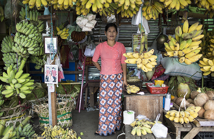 然而,纵使香甜的早茶、冰凉的米露、新鲜的蔬菜、漂亮的笼基,也无法遮挡菜市场上炽热的阳光,以及满地摊位所带来的拥挤。5月正值缅甸天气最热的时候,气温时常接近40度。人们逛在露天市场里,瞬间即会汗流浃背,更别说那些从早到晚或蹲或站着售卖的人们了。
