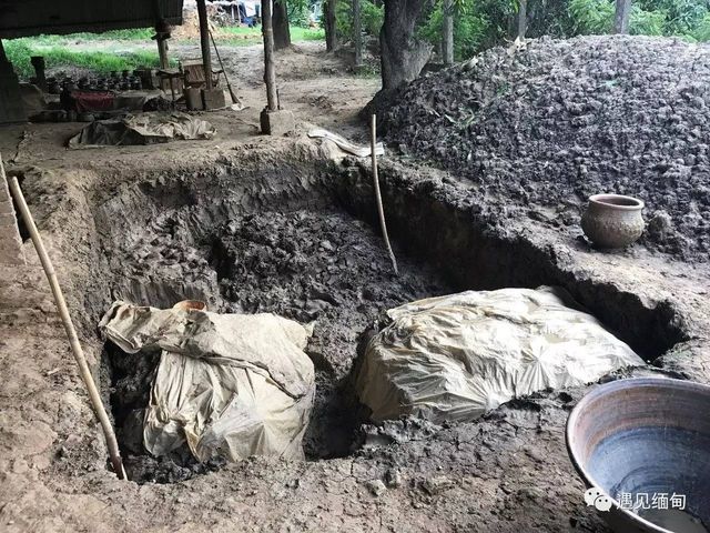 缅甸传统的和泥:将泥土倾倒在池里,采用人工脚踩的方式揉泥。