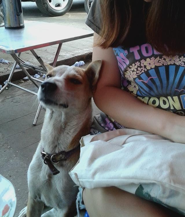这只狗一点鸡肉,它就很开心的贴着师姐坐,萌贱萌贱的