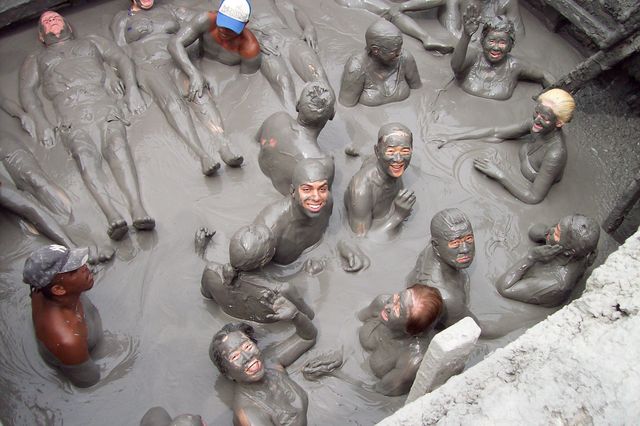 帶著混身泥漿,光著腳,沿著燙熱的泥沙小路,走到五十步遠的一條混濁小河中,讓土著女人用小桶打水幫忙把頭髮及全身的泥漿冲掉。因為該處沒有浴室設備,泥漿冲掉後,只能在外面的小水龍頭下用清水再略約冲一冲,等回到船上才洗澡了。趕緊換上衣服,回到大巴上。這時,就有幫忙冲泥漿的土著女人上車來,拿著帽子要小費。放下5美元說聲“謝謝”,在阿兵哥的護送下打道回船,就這樣,完成了這次奇特的“火山泥漿浴”之旅。