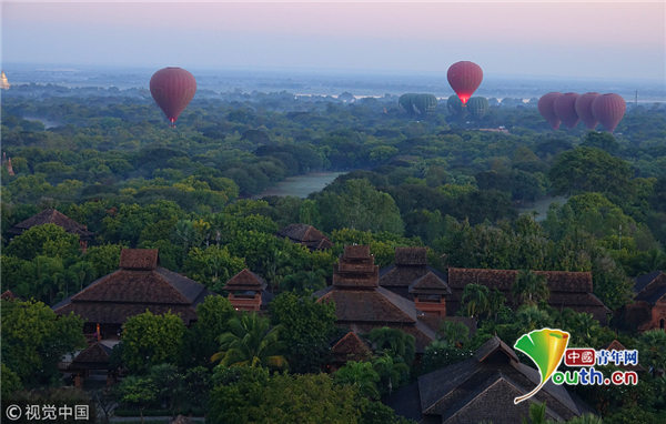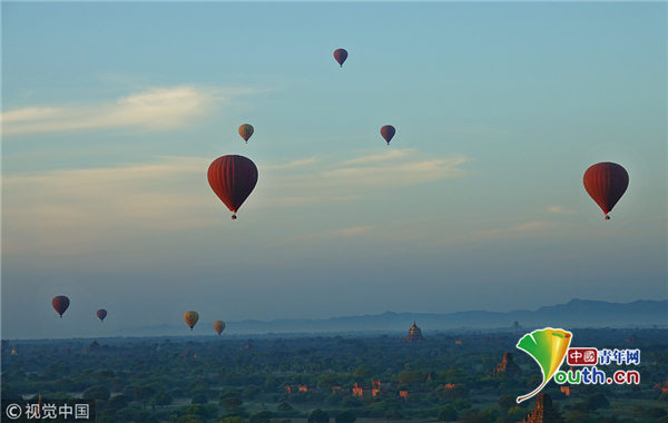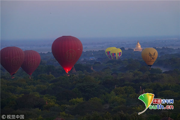 当地时间2019年1月12日,缅甸蒲甘热气球,它是世界最佳观赏热气球的地方之一,因为这里的热气球都是和太阳一起升起来的,晨光袅袅中万千佛塔散落在蒲甘大地,彩色的热气球冉冉升起,新生的红日美得震撼。从地面升腾而起的热气球仿佛是连接时空的纽带,何其的壮观和秀丽。位于缅甸中部的蒲甘是世界上最伟大的考古遗址之一, 一片绿意盎然的26平方英里的平原,部分覆盖在棕榈树和罗望子树林中,乘坐热气球可以俯瞰遍布着2000多座寺庙和佛塔的蒲甘平原,非常地壮观。