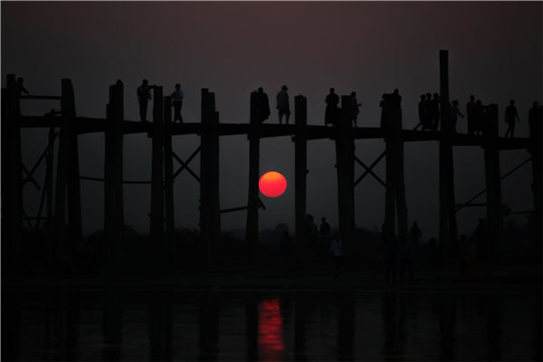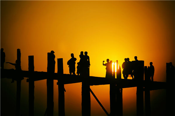 乌本桥是世界上最美十大的日落景点,最佳的观赏点需乘坐当地的木船在河上去欣赏。乌本桥全长1200米,桥柱与桥柱之间相距3米远,桥柱有1000多根。整座桥相接处没有使用一颗铁钉,全靠斗榫。历经160多年的风风雨雨,依然结实坚固,是目前世界上最古老和最长的柚木结构桥。柚木是缅甸的国宝,材质纹理线条优美,含有金丝,价格相当的昂贵