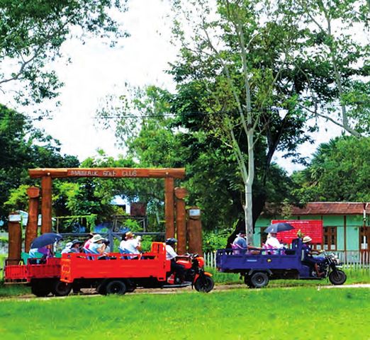 3. 外国游客坐三轮车游览历史古迹高尔夫球场