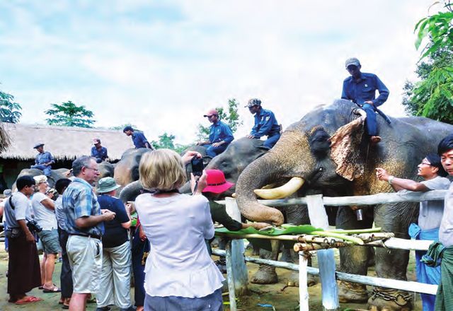 6. 外国游客们在Pyaswe大象营地给大象们喂食。)