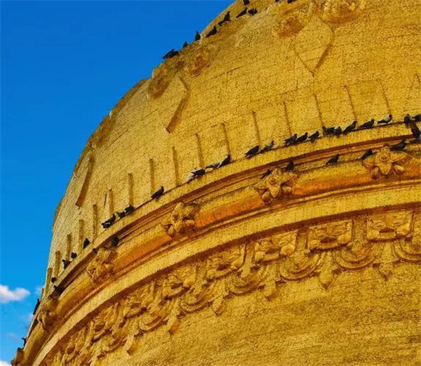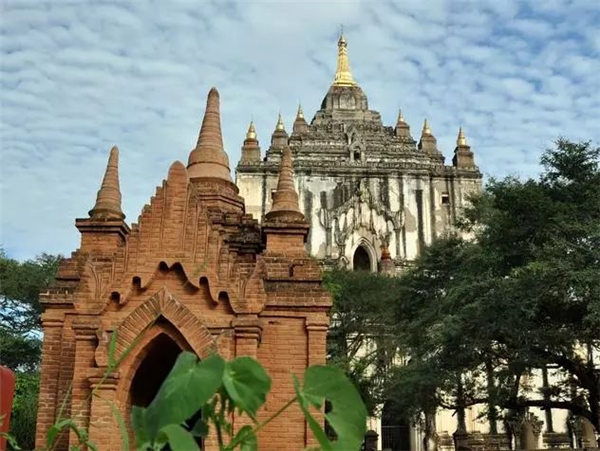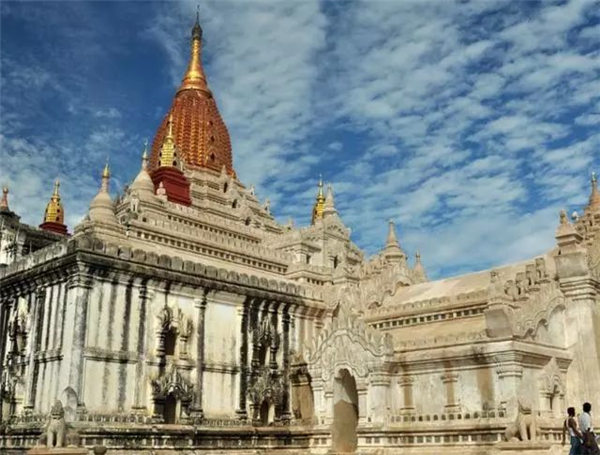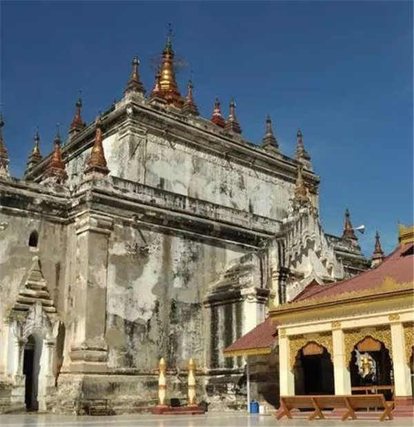 阿南达寺(阿难陀寺),阿南达寺由江喜陀王(Kyansittha)于1091年修建完成,属于早期的塔寺一体建筑,是蒲甘现存最完整造型最美丽的佛教寺庙,也被誉为蒲甘第一佛塔,其建筑工艺大大超越了之前的佛塔,而且建造时融入了缅甸特有的风格。整个寺院呈正方形,象征平衡与和谐。寺的周围分别有四条长长的走廊,每条走廊都通到中间院子里,院子很大,占地近百亩,到处开满鲜艳的花。