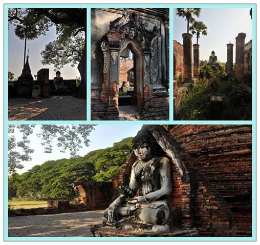 从我们的驻地出发,沿着新蒲甘的方向一路走来,更加吸引我们使人心动的是那些散落在街头巷尾、田间地头、树林山坳间的各式各样的寺、塔。这些随处可见的寺塔色彩不一、造型各异,有的完整有的残缺,有的甚至只剩下残垣断壁,在这里时空仿佛停滞了,只有它们在用无声的语言向过往行人讲述着昔日的辉煌和遭受的磨难。