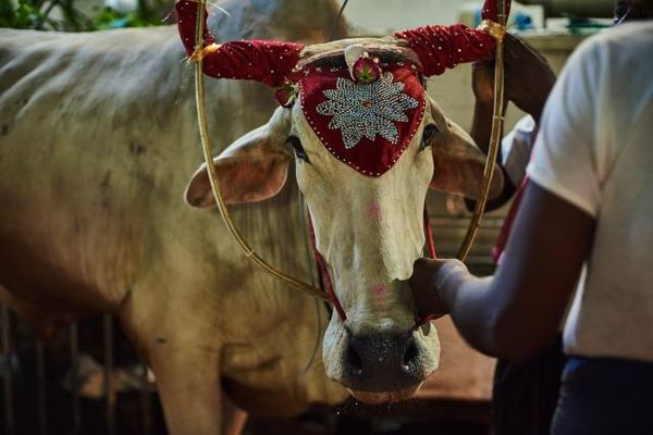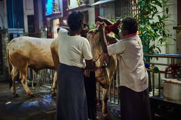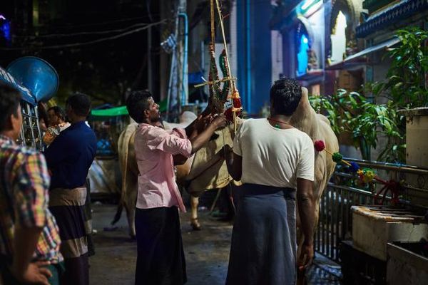 图为:印度人在传统节日给神牛装扮。 在仰光的街头可以看到有不少印度餐馆,走在巷子里会看到印度小孩在玩耍,也有印度人卖槟榔的小摊。他们依旧保持着很多印度人的传统习俗。