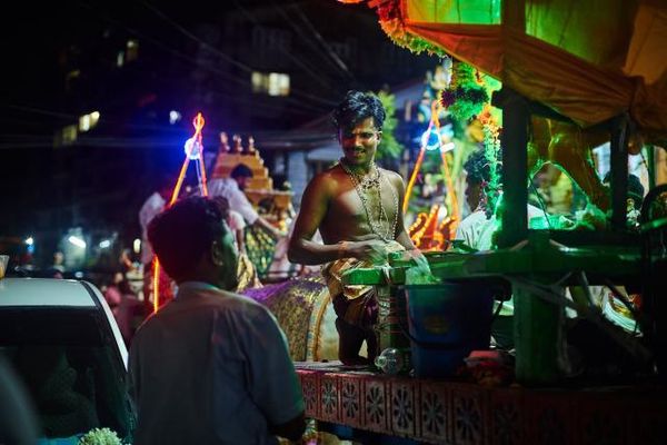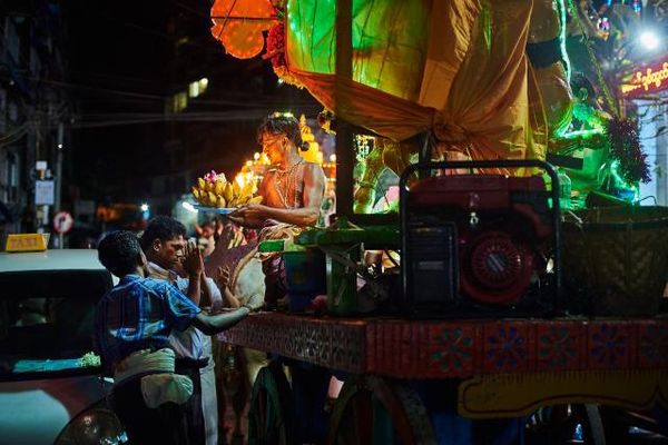 图为:主持节日仪式的印度人。 如今在仰光的街头依旧可以看到很多印度人,这些印度人大都是信奉印度教的,他们跟缅甸人的关系和平。