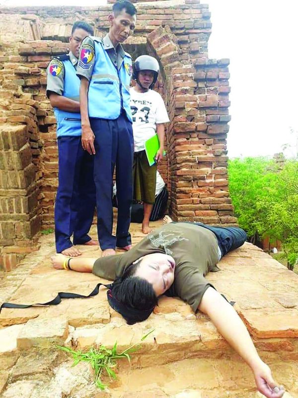 “今天上午11时45分才接到有关讯息,事件发生在第448号佛塔、Min Nan Thu四面砖寺庙内。寺庙内有楼梯直通上方,死者就是在楼梯口倒地死亡的,身体上没见到什么外伤,只在右边膝盖有擦伤之处。”良乌专区警察局一位负责人如是说道。
