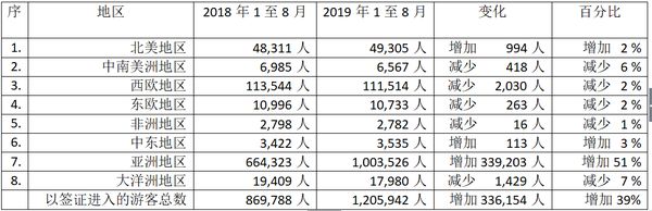 (i)2019年头8个月内,以护照签证由航空、游轮及边境口岸进入者超过120万人,与2018年同期相比增加近33.6万人,增加率为39%。