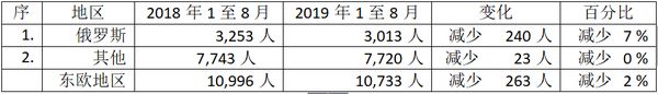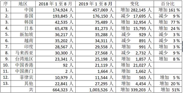 2018年头8个月及2019年头8个月进入缅甸的游客人数比较表