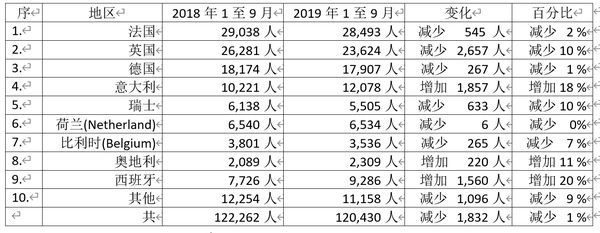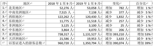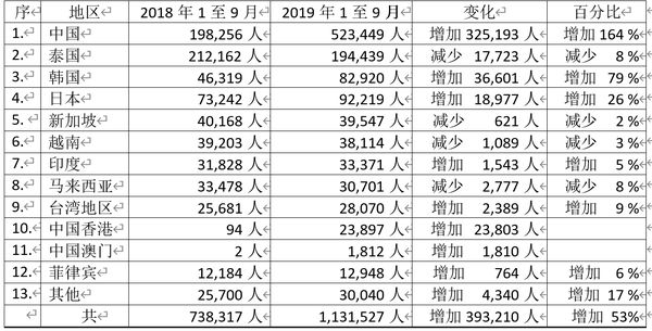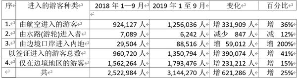 (1)2019年头9个月内,以护照签证由航空、游轮及边境口岸进入者超过135万人,与2018年同期相比增加近39万人,增加率为41%。