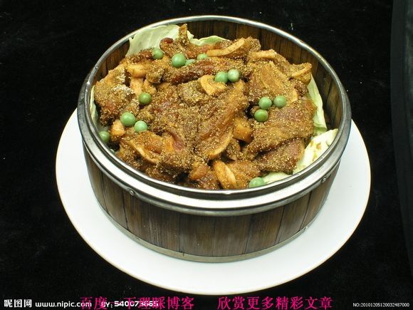 以主料带皮五花肉加米粉和其他调味料制作而成。粉蒸肉糯而清香,酥而爽口,有肥有瘦,红白相间,嫩而不糜,米粉油润,五香味浓郁。根据烹饪方法,可以偏辣,也可以偏甜,配料可以辅以老藕、南瓜、红薯等配菜。
