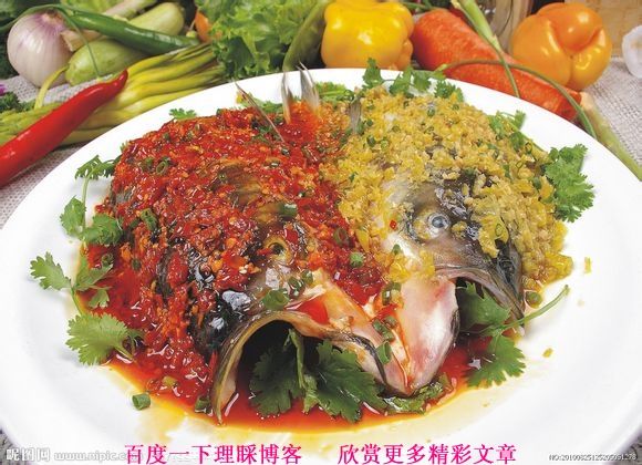 剁椒鱼头属湘菜系,是湘潭的一道名菜。以鱼头的“味鲜”和剁辣椒的“辣”为一体, 风味独具一格。菜品色泽红亮、味浓、肉质细嫩。肥而不腻、口感软糯、鲜辣适口。