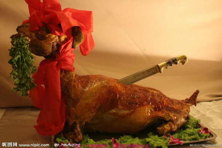 历史悠久的烤全羊是新疆菜的一大名馔,其风味可以同北京烤鸭相媲美。之所以如此驰名,除了它选料考究外,就是它别具特色的制法。选取周岁以内的羊羔为主要原料,宰杀后去其蹄及内脏,用精面粉、盐水、鸡蛋、姜黄、胡椒粉和孜然粉等调成糊状,均匀地抹在羊的全身,然后用钉有铁钉的木棍,从头穿到尾,放入特制的馕坑或大型的烤箱,焖烤 1 小时左右即成。烤全羊是最名贵的新疆菜肴之一,一般用来招待贵宾,是高级宴席中不可缺少的菜肴。因此,全羊烤好后不能拿上来就吃,要系上红色头结,嘴里含上芹菜或香菜,造型犹如一只活羊卧着吃草,再放在餐车上,推至餐厅,任宾客随意切割品尝。烤全羊色泽光亮、皮脆肉嫩、香浓味美。吃的时候剔肉切片,蘸盐而食。