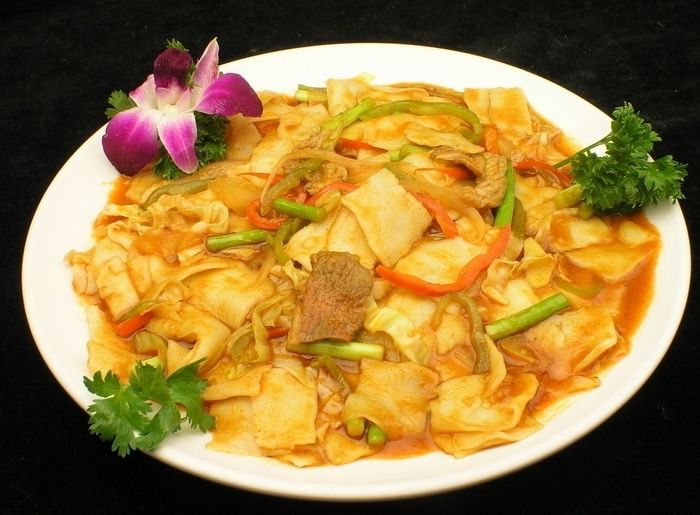 (4)将煮好的面片放到炒好的菜中,同炒片刻,加上酱油,即可食用。食时可根据各人口味,加点辣椒酱或醋等调味品,则更味美可口。