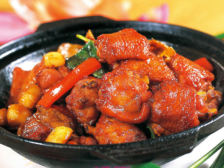 三杯鸡是台湾的代表菜式。何谓三杯鸡即一杯酱油膏、一杯米酒、一杯黑麻油。精选上等的鸡腿和鸡翅中,鸡肉经过葱、姜、蒜和酱油膏24小时腌制,把腌制好的鸡肉放到油锅中炸到金黄,再用麻油把蒜瓣炒至金黄,把蒜瓣和鸡肉放入锅中同炒,再加入三杯酱料。此道菜中还加入了一种台湾特有的香料——九层塔。三杯鸡味道浓郁,更适合北方人的口味。香嫩的鸡肉,味重的调料,清香的九层塔,无不让人垂涎欲滴。