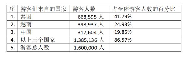 在上一年度的头6个月中,以旅游签证进入老挝的游客人数仅有42,197人,所以今年游客人数增加显得更加明显了。老挝国家政府为了振兴其国家的经济,已经把旅游行业当做一个重点行业加强这方面的工作了。