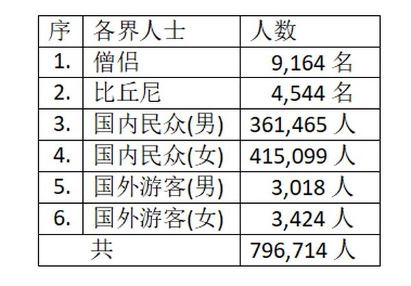 在这一个月内,前来朝拜此大金塔的游客民众人数中,僧侣有9,164名,比丘尼4,544名,国内民众男性361,465人,女性415,099人;国外游客人数男性3,018人,女性3,424人,国内外游客民众人数共为796,714人。