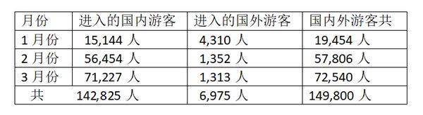 由1月份开始至3月份,国内游客逐月明显地增加。国外游客则是1月份最多,2、3月份 时减少了。