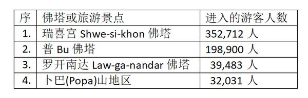 据5月20日出版的缅文《镜报》报导,在2024年4月份内进入蒲甘古文化遗产区的游客人数,根据旅舍旅馆的登记,这期间在这些旅舍旅馆投宿的国内游客人数有54,853人,国外游客993人,国内外游客共55,846人。而更多的是当日就离开的“一日游”旅客。另外根据各著名佛塔等旅游景点的记录,4月份内进入各大佛塔的游客人数如下表: