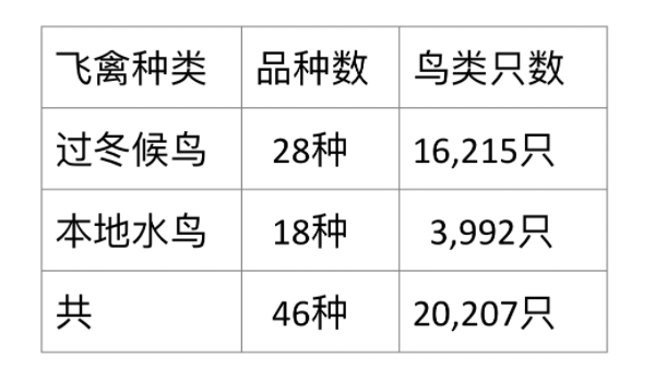 今年1月间统计到的过冬候鸟数据及本地水鸟数据与去年统计数据相比,鸟类品种少了一种,飞禽总数少1,200多只。